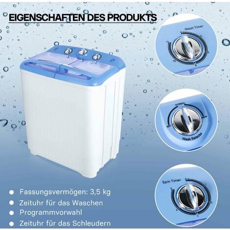 La lavadora de camping dispone de una bomba, una función de centrifugado y un temporizador, todo ello integrado en un moderno dise?o. Con esta lavadora son posibles diferentes programas de lavado, para ropa normal (en 3 variaciones), para prendas delicadas y un programa de centrifugado. El centrifugado cuenta con una potencia de 250 vatios. El temporizador de centrifugado puede ajustarse con una duración de programa de hasta 5 min y el temporizador de lavado de hasta 15 min. La temperatura del ciclo de lavado se determina a través del agua que se llena en la lavadora. La propia máquina no calienta el agua.